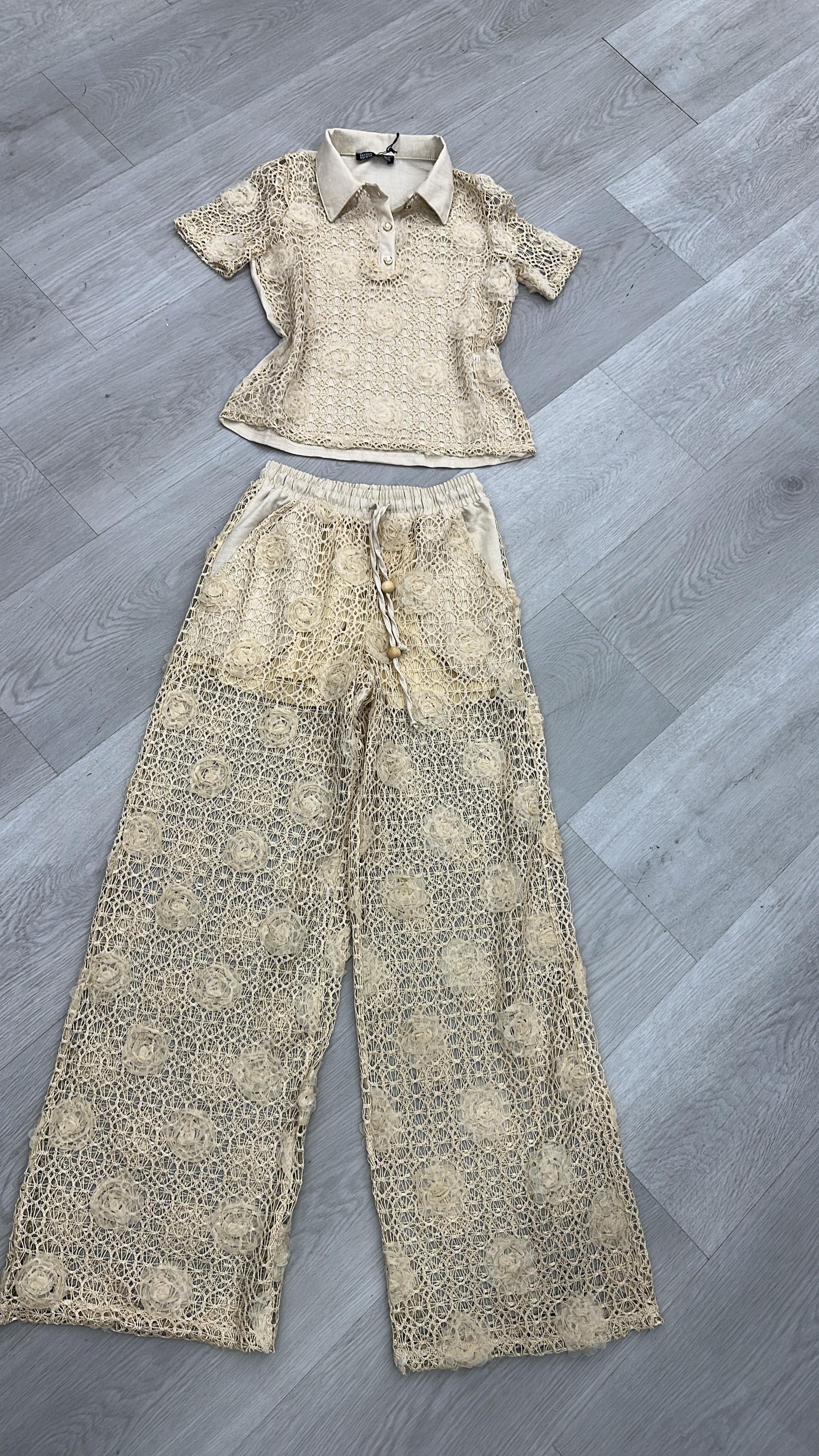 SET BLUSA Y PANTALON DE MALLA BEIGE CON ROSAS.